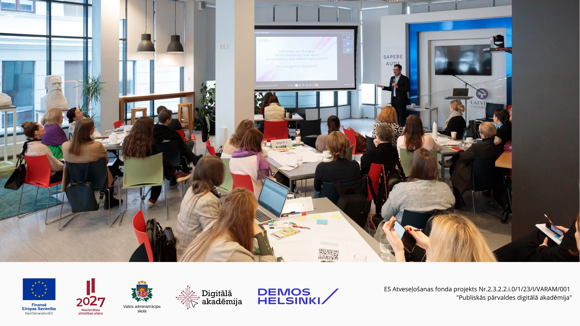 Mācības notiek ar Eiropas Savienības Atveseļošanas fonda atbalstu projekta Nr.2.3.2.2.i.0/1/23/I/VARAM/001 "Publiskās pārvaldes digitālā akadēmija" ietvaros.